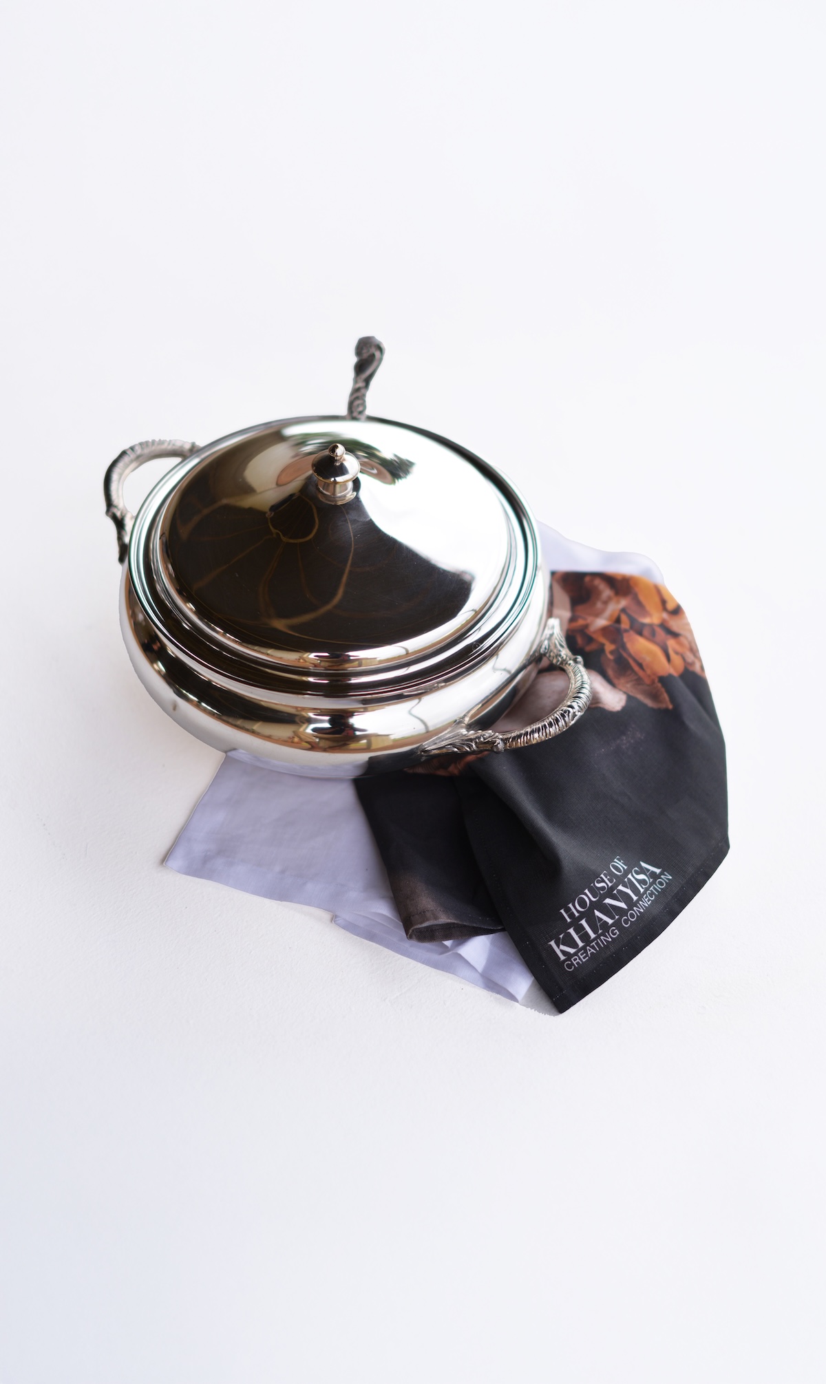Vintage pair of silver serving bowls and utensils for soups and stews.